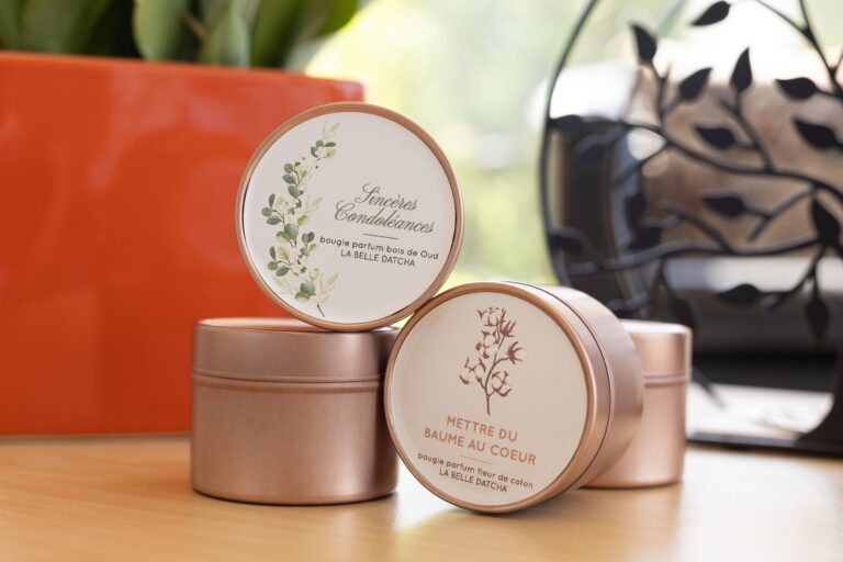 Bougies parfumées artisanales françaises, façonnées et coulées à la main en Vendée. Ces pièces raffinées sont vendues à la boutique, soit pour apporter une ambiance chaleureuse lors du recueillement, ou pour offrir en signe d’affection à la famille du défunt.