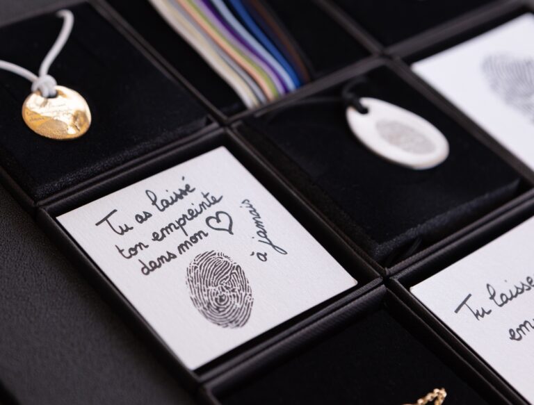 Création sur mesure de bijoux commémoratifs : pendentifs, chevalières, bracelets intégrant une trace symbolique du défunt (cendres, mèche de cheveux, empreinte).